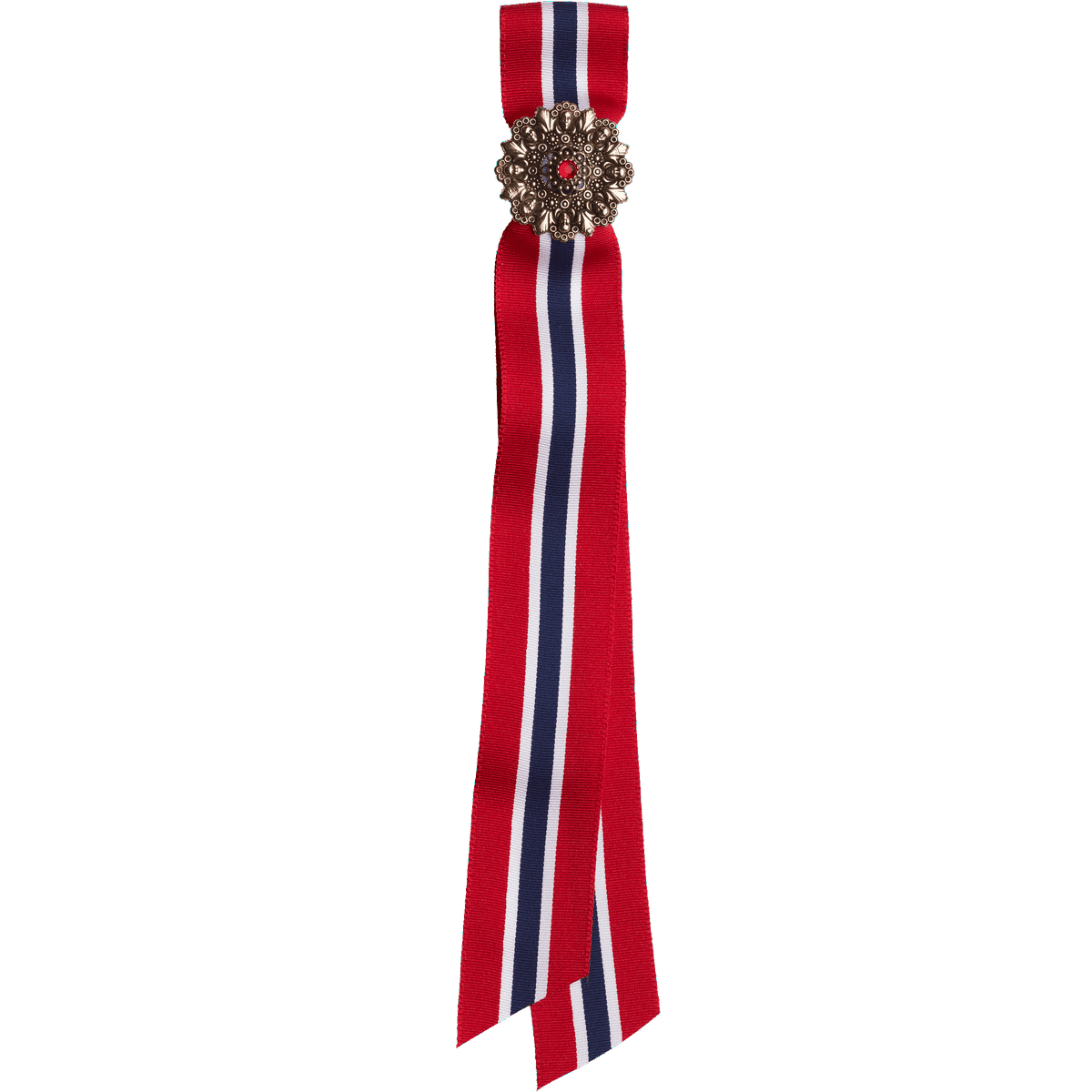 17.mai-sløyfepin 2-i-1 med raud stein, gml forgylt