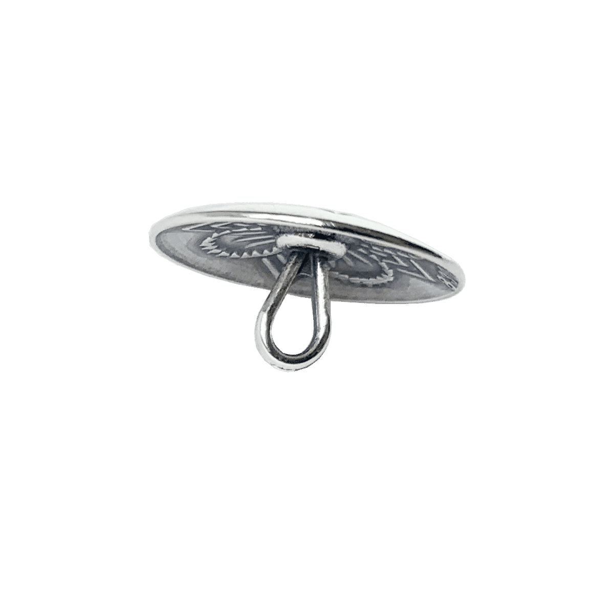 Denne firbladsroseknappen er flat, og 19 mm stor og har lang hempe.