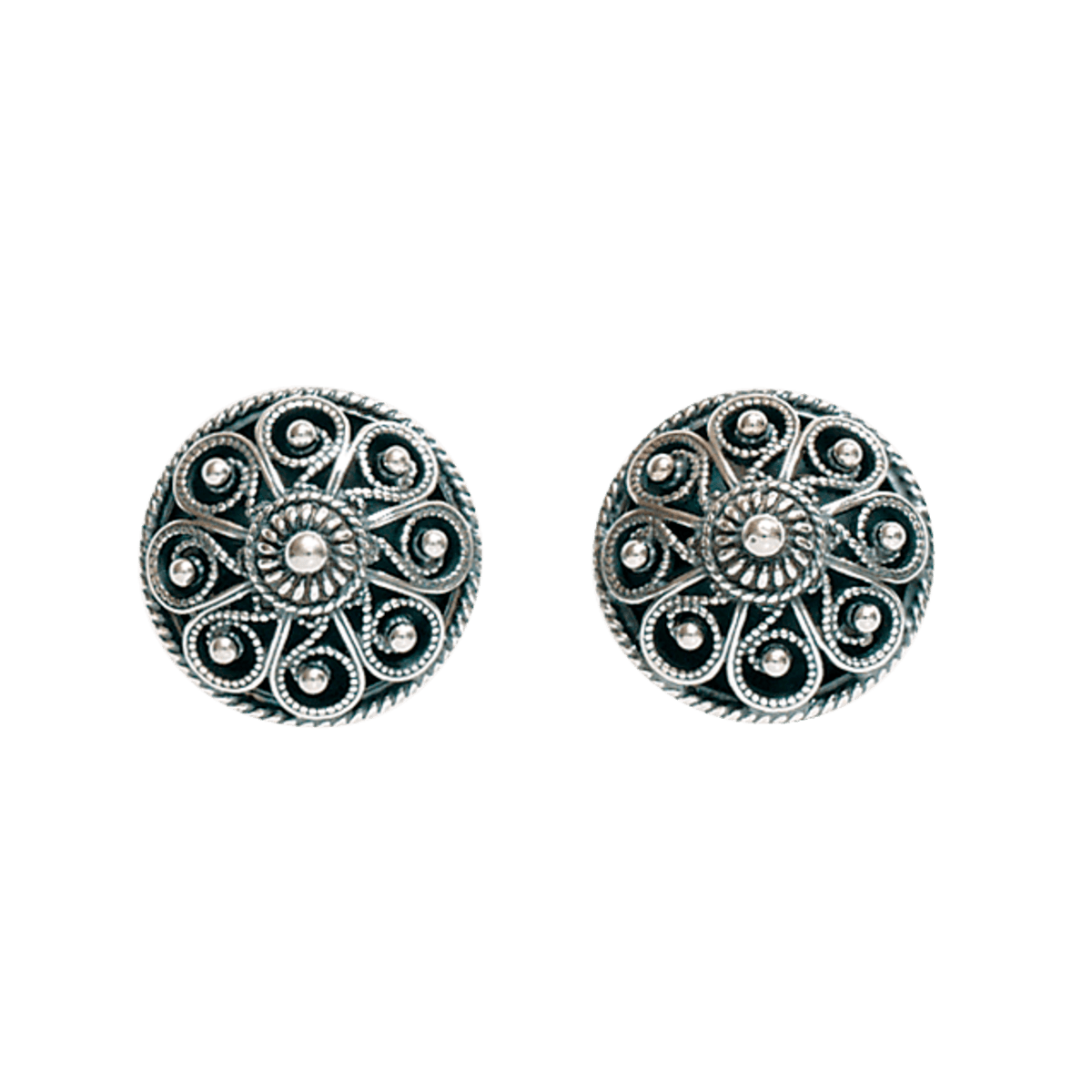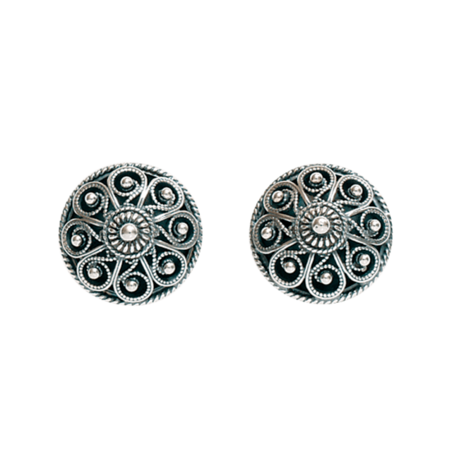 Armknapper av "såteknapp"-modellmed bunn og stolpe. Diameter på knappen er 17 mm oksydert sølv. Leveres som par.
