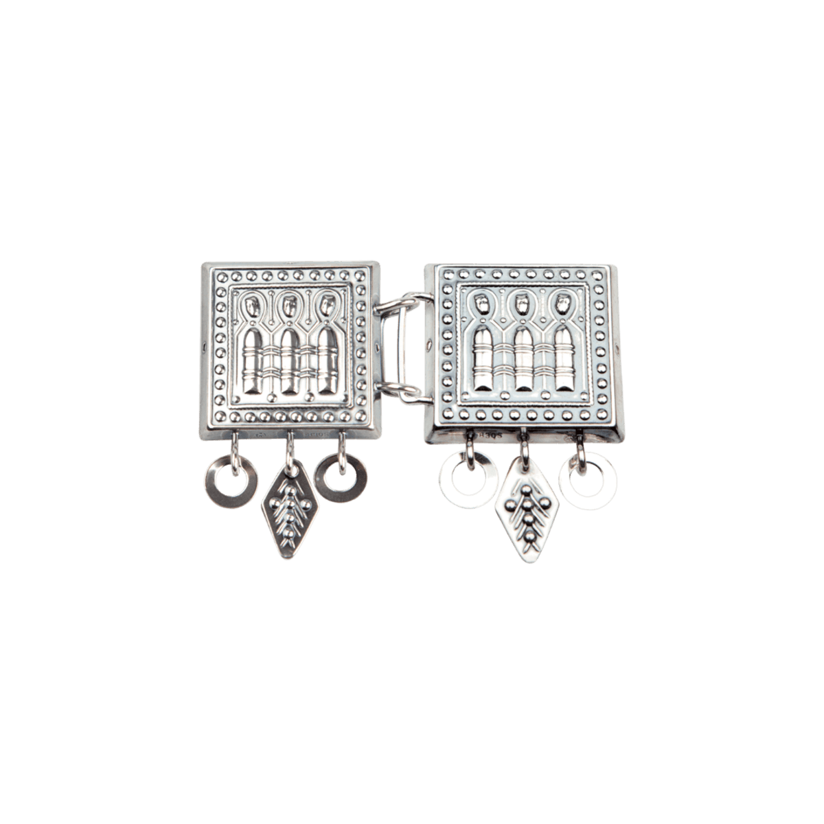 Denne beltespennen er 7 cm bred og har snipplauv og ringer i hengene. Leveres som par.