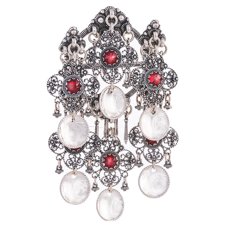 Bøheradsring Nr. 9 med røde stener kruser og løv, oksidert