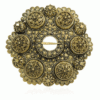 En ganske stor bolesølje med en bunn på 9 cm i diameter. Nydelig laget med mange detaljer. Denne er tofarget, gammelforgylt og oksyderte rosetter på de seks store bolene.