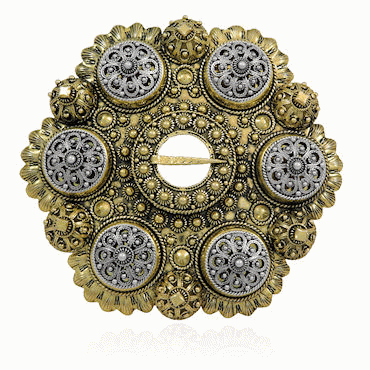 En ganske stor bolesølje med en bunn på 9 cm i diameter. Nydelig laget med mange detaljer. Denne er tofarget, gammelforgylt og oksyderte rosetter på de seks store bolene.