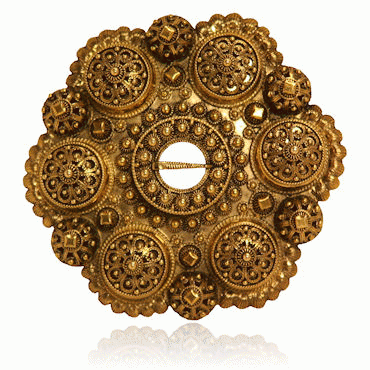 Denne bolesølja er 9 cm. i diameter. Detaljrik sølje, pent arbeide. Håndarbeide med unntak av rosettene på bolene. Gammelforgylt.