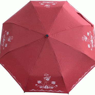 Denne røde paraplyen har et mønster som passer til Follobunaden, paraplyen kan slås helt sammen og leveres med trekk.