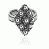 En ring med en forseggjort, gjennombrutt rosett. Rosetten er 2 cm i diameter, og ringen er åpen slik at den kan reguleres til alle str.