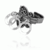 En ring med en forseggjort, gjennombrutt rosett. Rosetten er 2 cm i diameter, og ringen er åpen slik at den kan reguleres til alle str.