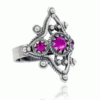 En ring med 6 små kruser rundt kanten og en liten demant i midten. Den er 1,3 cm i diameter. Ringen er åpen slik at den kan reguleres til alle str.