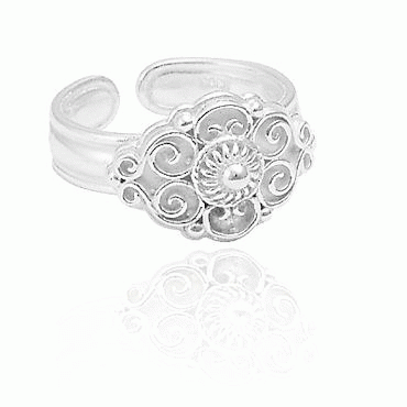 Denne ringen har et dekorativt filigransparti med en "kruse" i midten. Ringen er åpen slik at den kan reguleres i alle str.