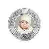 Rund fotoramme i ekte tinn. Felter til gravering av alle fødsels- og dåpsdata.