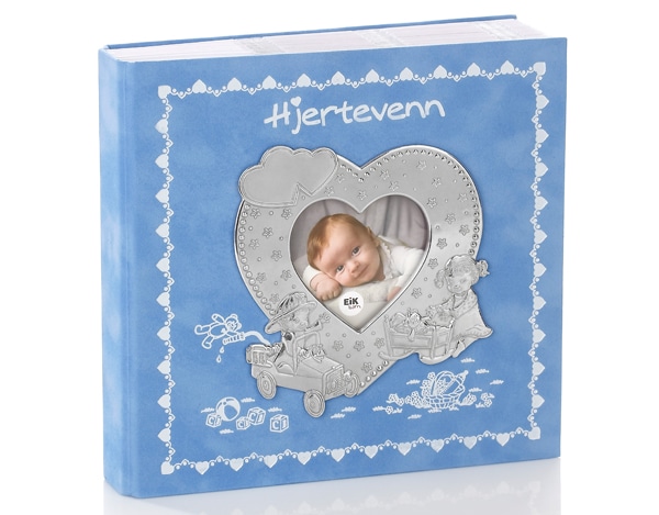 Album i velur med tinndekor som kan graveres. Plastlommer til enkel montering av inntil 200 bilder i str 10 x 15 cm.