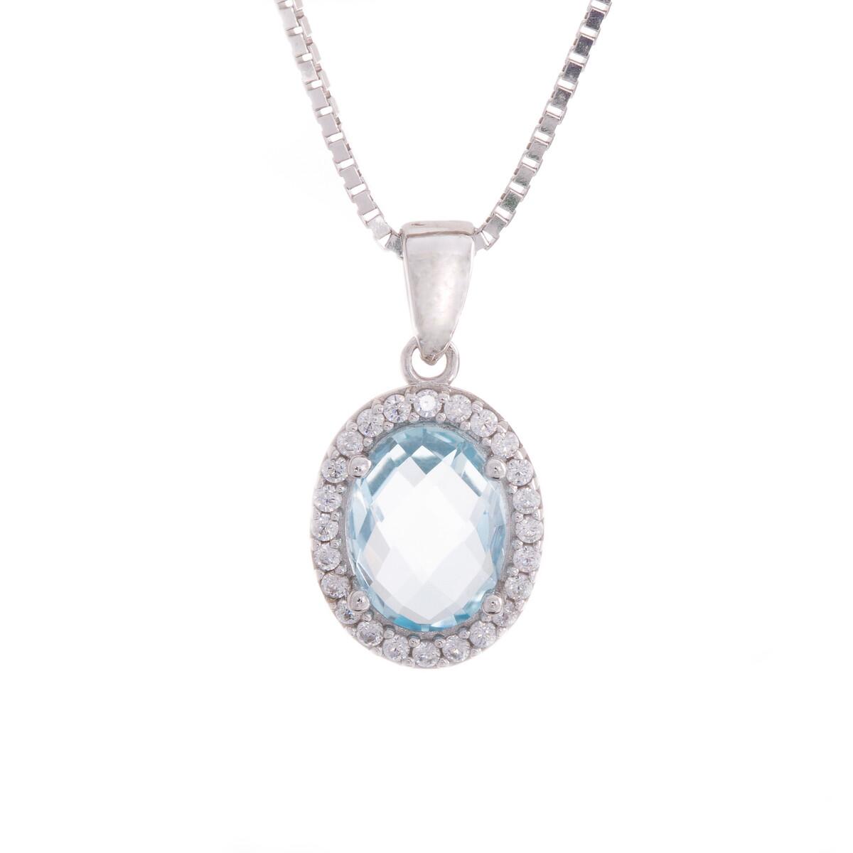 Elegant anheng i 14 karat hvitt gull med en lyseblå zirkonia i midten og små stener rundt i klassisk rosett-stil. Med målene 11,5 x 9,4 mm synes det godt, men holder seg fortsatt stilrent. Et smykke som gir litt farge og glans uten å bli for mye – passer like godt til hverdags som til fest.