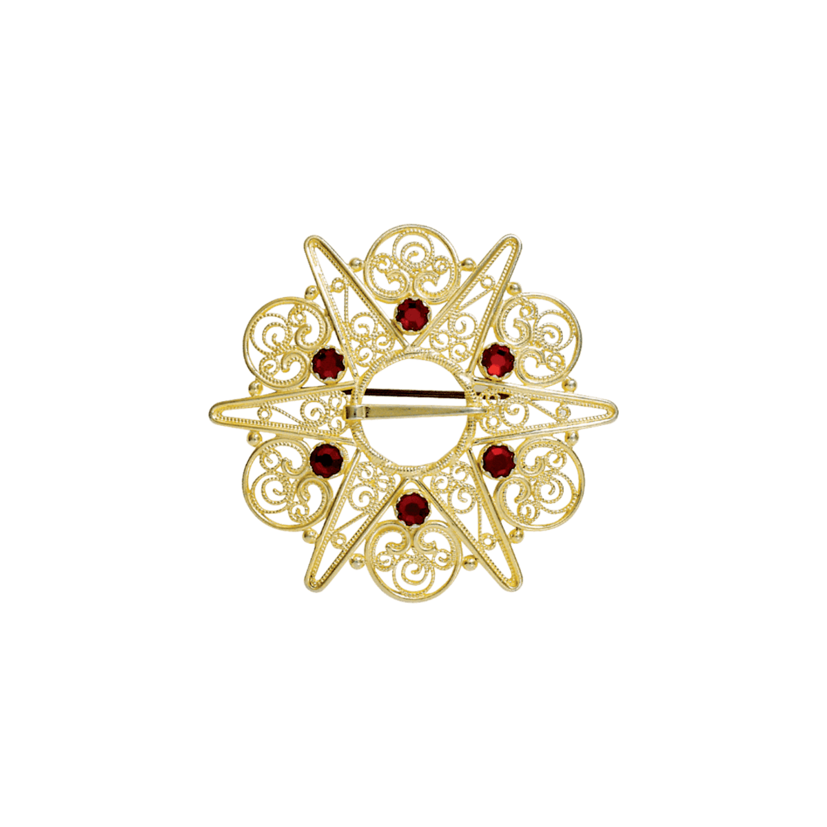 Denne vakre filigranssølja er 5,3 cm stor, og har røde stener på.