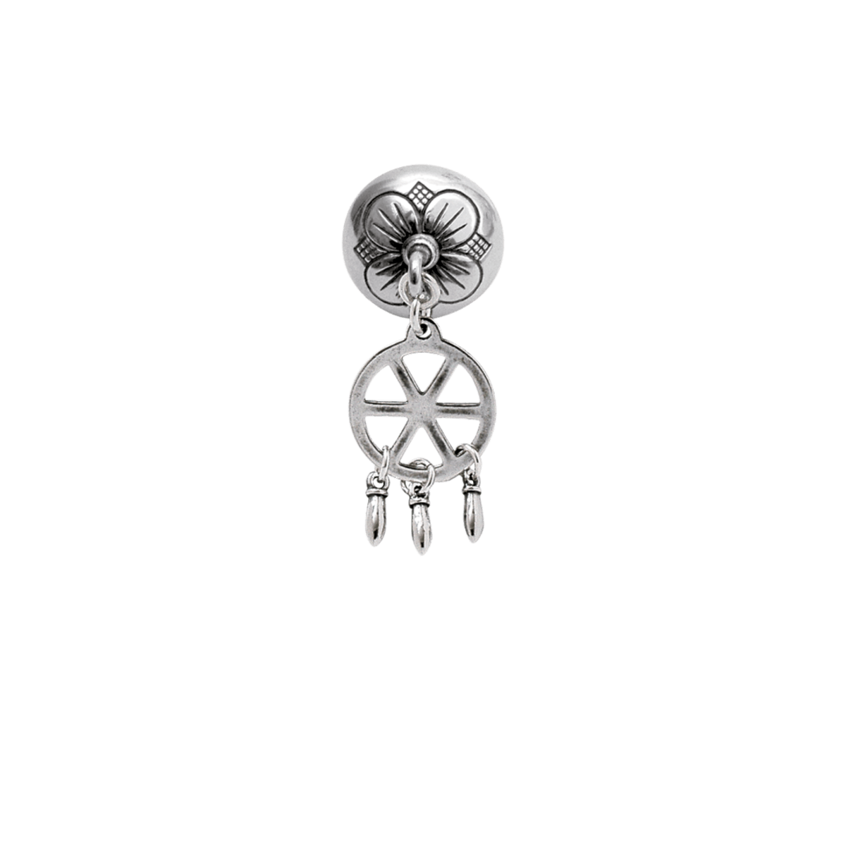 Denne halsknappen er laget av en fireblads roeseknapp. I ringen under henger tre korn. Knappen er 4,3 cm lang.