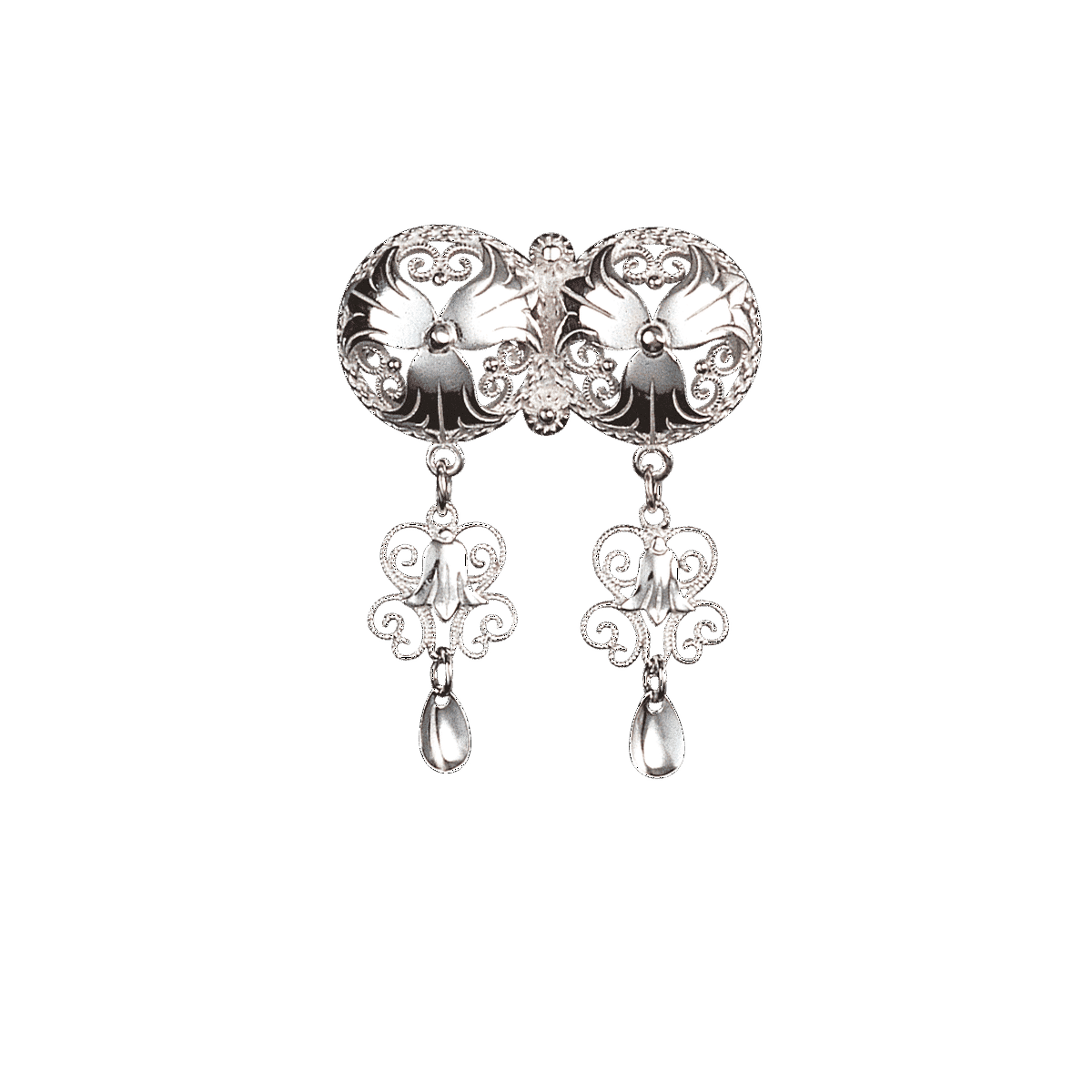Denne halsnåla av dobbel lofotenknapp er 3,5 cm bred og 4,5 cm lang.