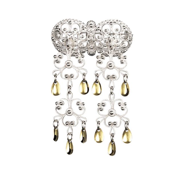 Denne 4 cm brede halsnåla har 6,5 cm lange heng.