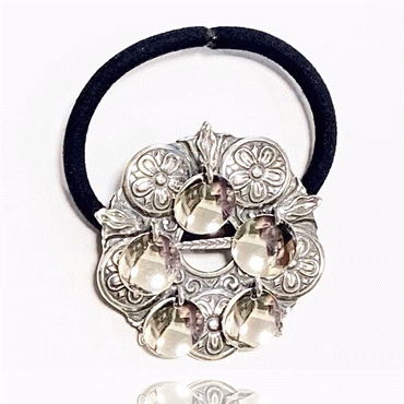 Bunad hårpynt oksydert med strikk, ca. 4,5 cm i diameter.
