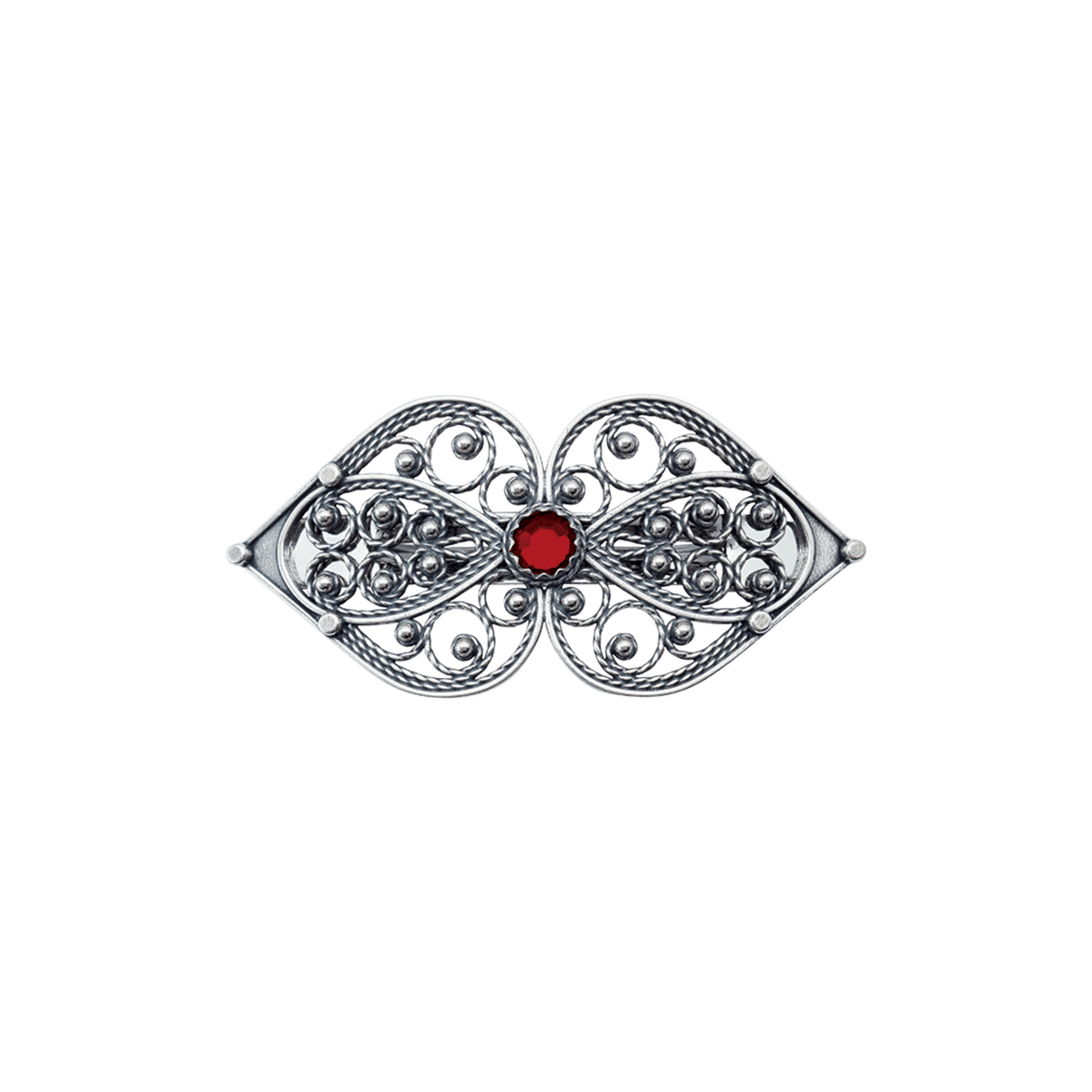 Hårspenne hjartefiligran med raud stein, lita, oksidert