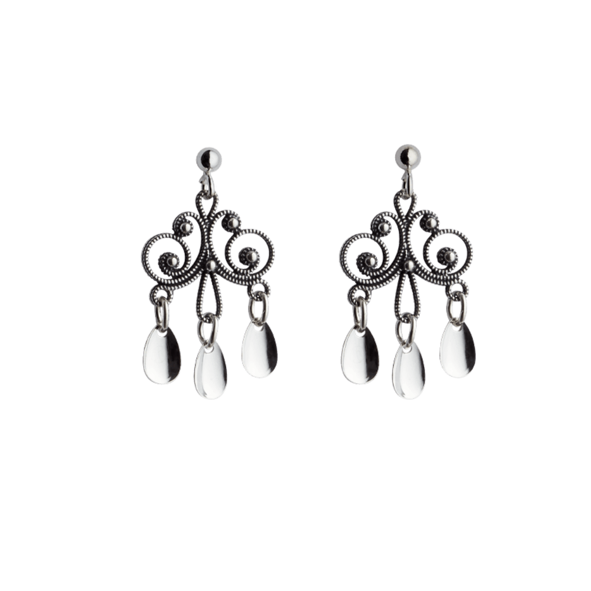 Ørepyntene er laget av et pent filigransheng med drypplauv. 27 mm lange. Leveres som par.