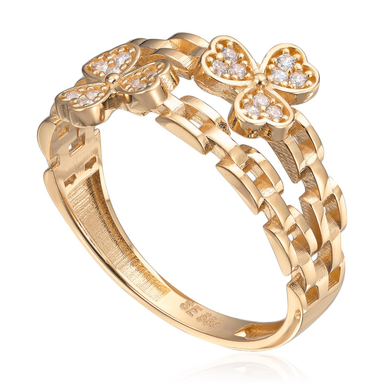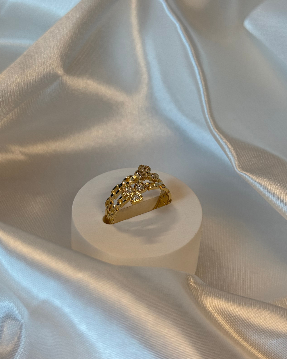 Ring i gull, trekløver og hjerter med Zirkonia