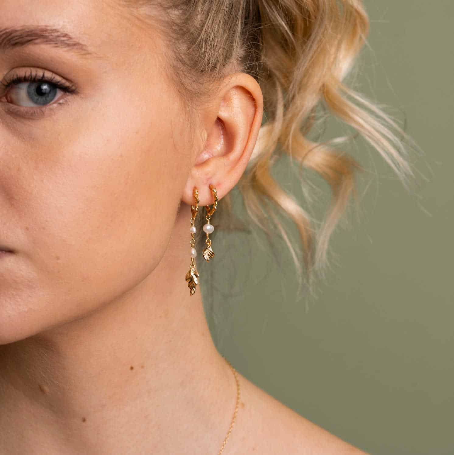 Trendy øredobber med strukturert effekt, vakre keshi barokkperler og bladformet anheng. Finnes også i kort og lang modell, samt rhodinert.