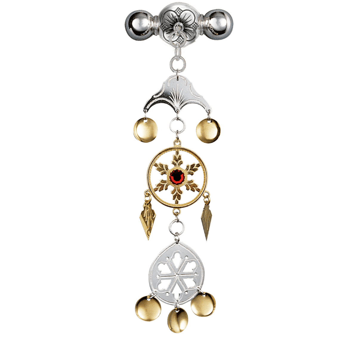 Sunnmørsknappen er en særegen, nydelig sølje. Denne varianten har en rød stein på midtdelen av henget.