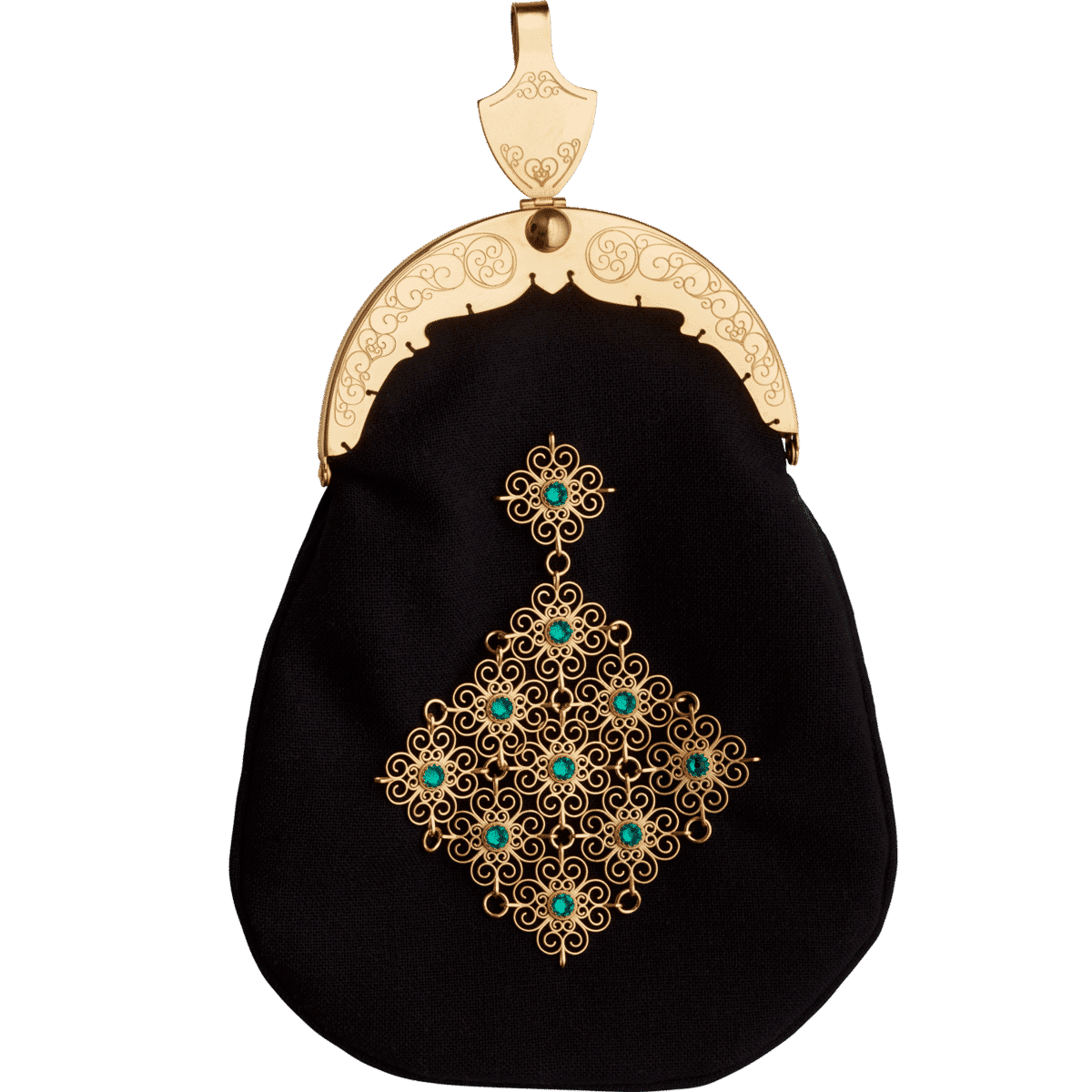 Veske med veskepynt filigran, med grøn stein, forgylt