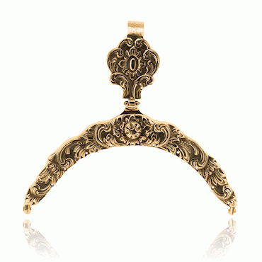 Denne varianten av veskelås 8 er støpt i sølv, og så forgylt. Kjennetegnes ved at knappen til å åpne vesken med er mønstret, ikke glatt. 15 cm bred.