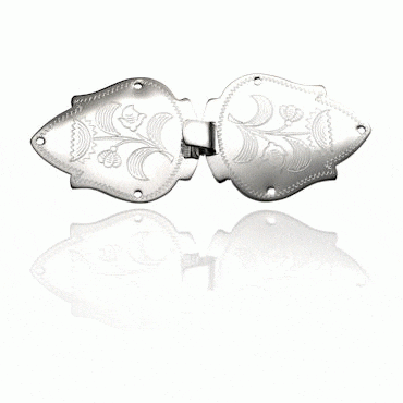 Nordlandsspennene har rene, elegante linjer. Og naturligvis blomstermotiv. Denne spennen er gravert og er 6,8 cm fra spiss til spiss. Leveres som par. Bunadsølvet fra Rørvik er sett på som det originale bunadsølvet for Nordlandsbunaden.